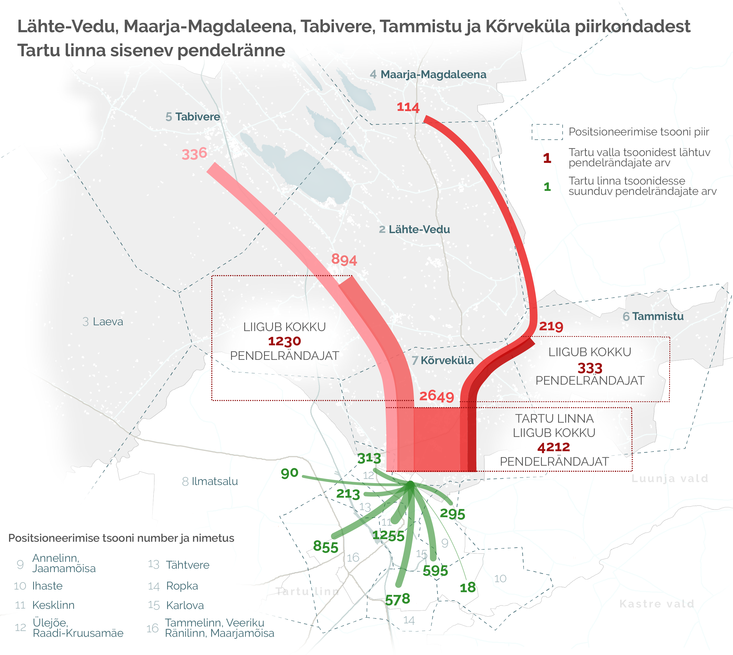 Lähte-Vedu, Maarja-Magdaleena, Tabivere, Tammistu ja Kõrveküla piirkondadest Tartu linna sisenev pendelränne (andmed: Positium OÜ, 2017.a andmed; joonis Hendrikson&Ko).