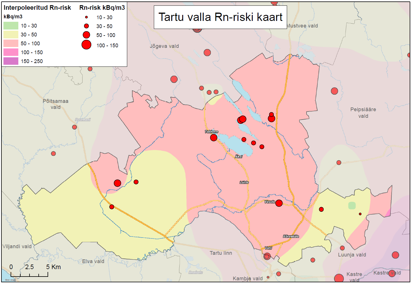 Vaata kaardilTartu valda läbib ulatuslik koridor, kus kohati võib esineda kõrge radoonisisaldusega pinnaseid.